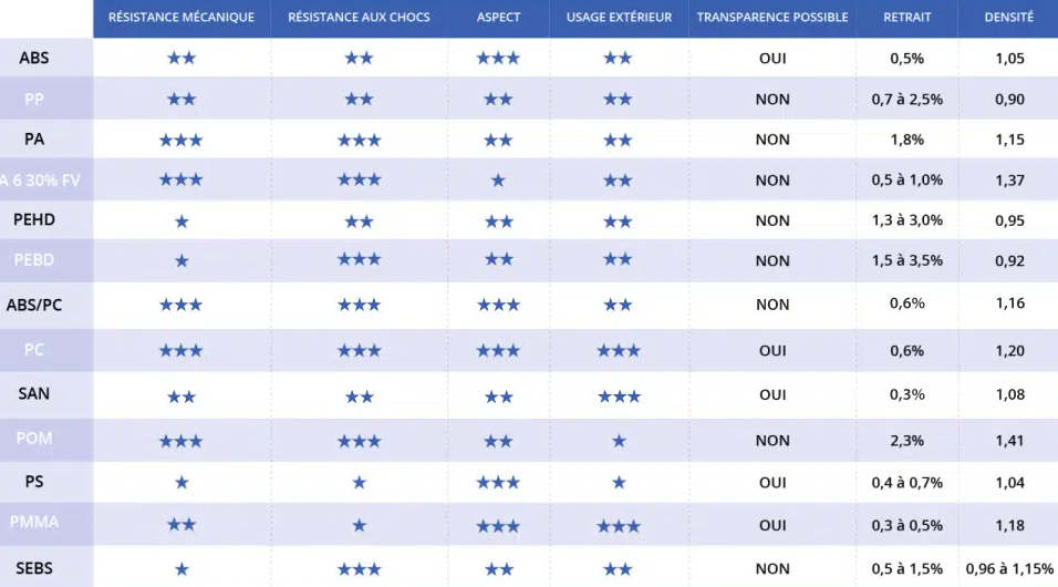 Indiquez la matière de la pièce plastique que vous souhaitez produire avec charge ou sans charge.
